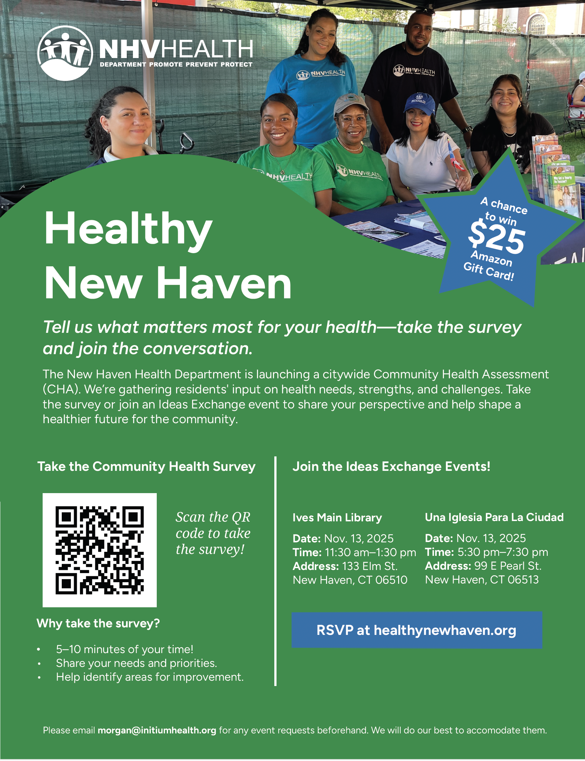 Print and post our flyers (8.5x11 and 11x14) in common spaces, like coffee shops, libraries, schools, and community centers, or share them with your networks. These materials make it easy to invite your neighbors to take part in shaping a healthier New Haven.